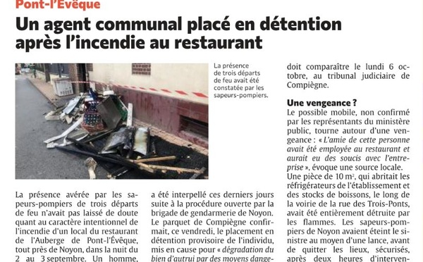 L'auteur de l'incendie ayant touché l'Auberge de Pont-L'Évêque a été identifié, comme le précise le Courrier Picard. Nous avions consacré un article à ce fait de délinquance récemment, aujourd'hui nous apprenons que l'enquête de gendarmerie a été rapide et a conduit à l'arrestation d'une personne,...