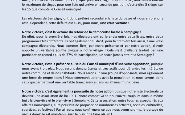 Nous n'avons pas obtenu la majorité des voix et notre programme ne sera donc pas appliqué à Sempigny!