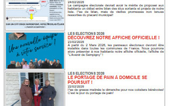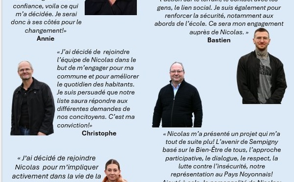 La campagne électorale vit ses trois dernières semaines. Notre équipe est toujours autant mobilisée: porte à porte, tractages, rencontres avec les habitants, ... Tous unis pour l'avenir de Sempigny, nos colistiers sont plus que jamais déterminés et motivés!