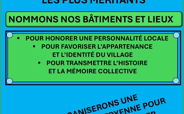 Pour honorer des personnalités locales méritantes, et pour identifier et valoriser notre village, nous souhaitons nommer des bâtiments communaux et lieux importants de la commune.